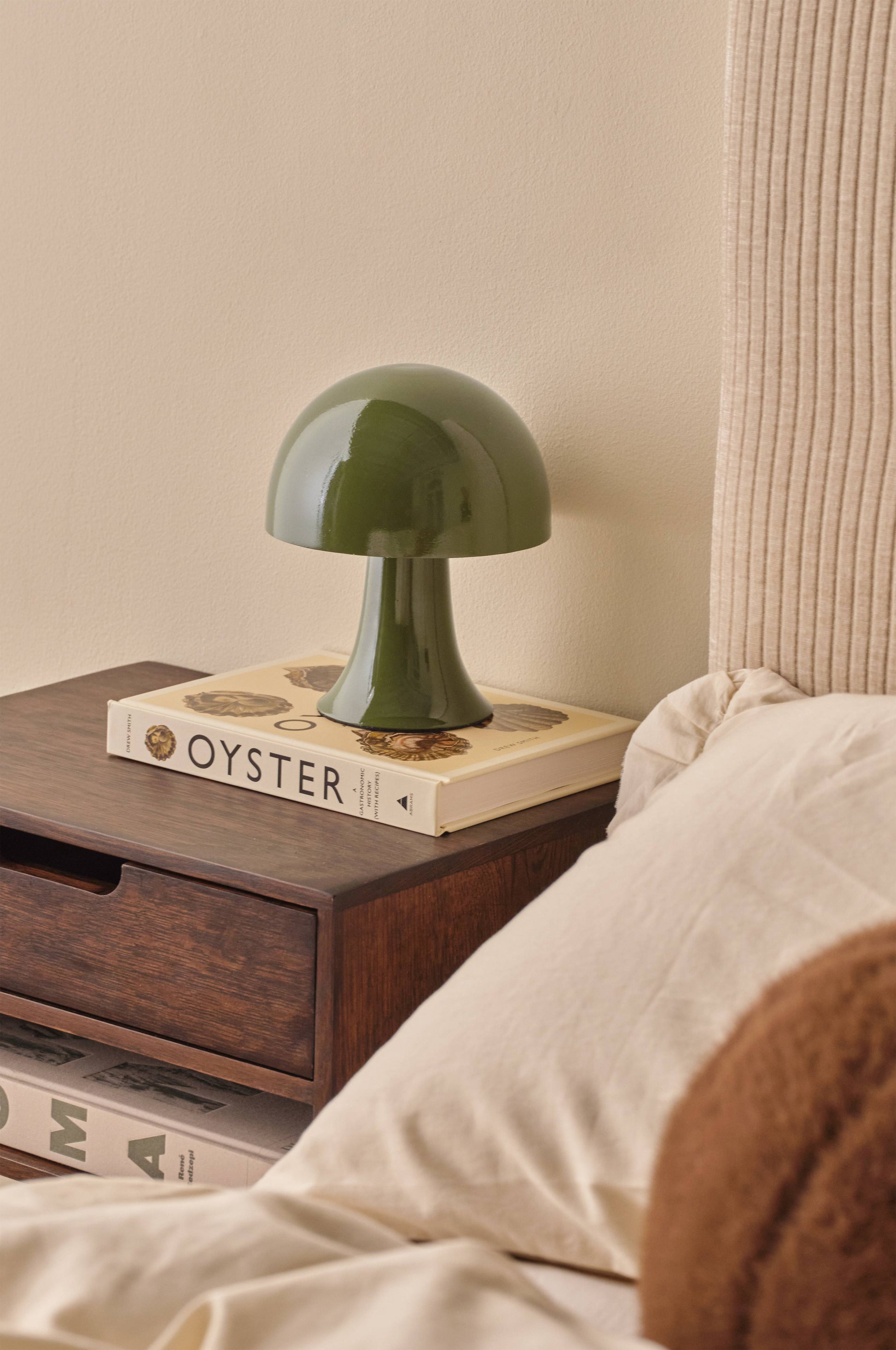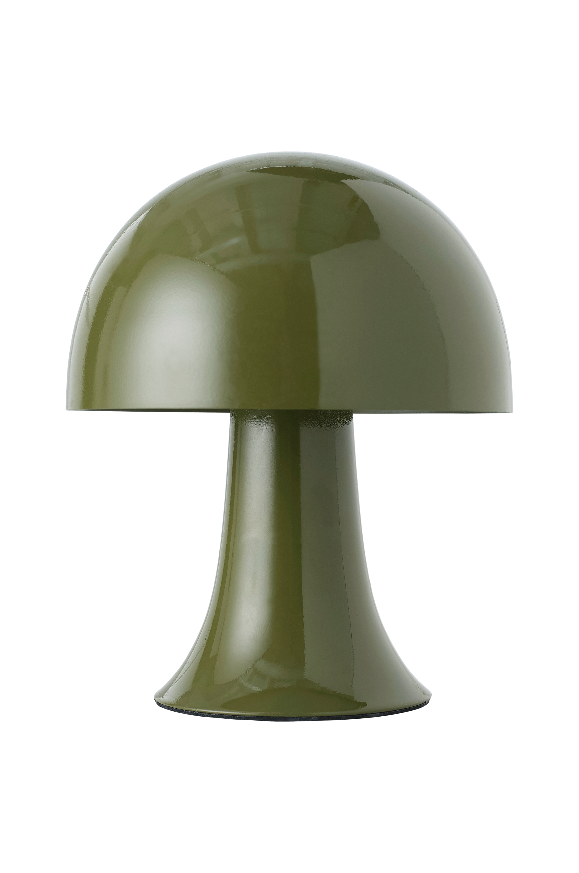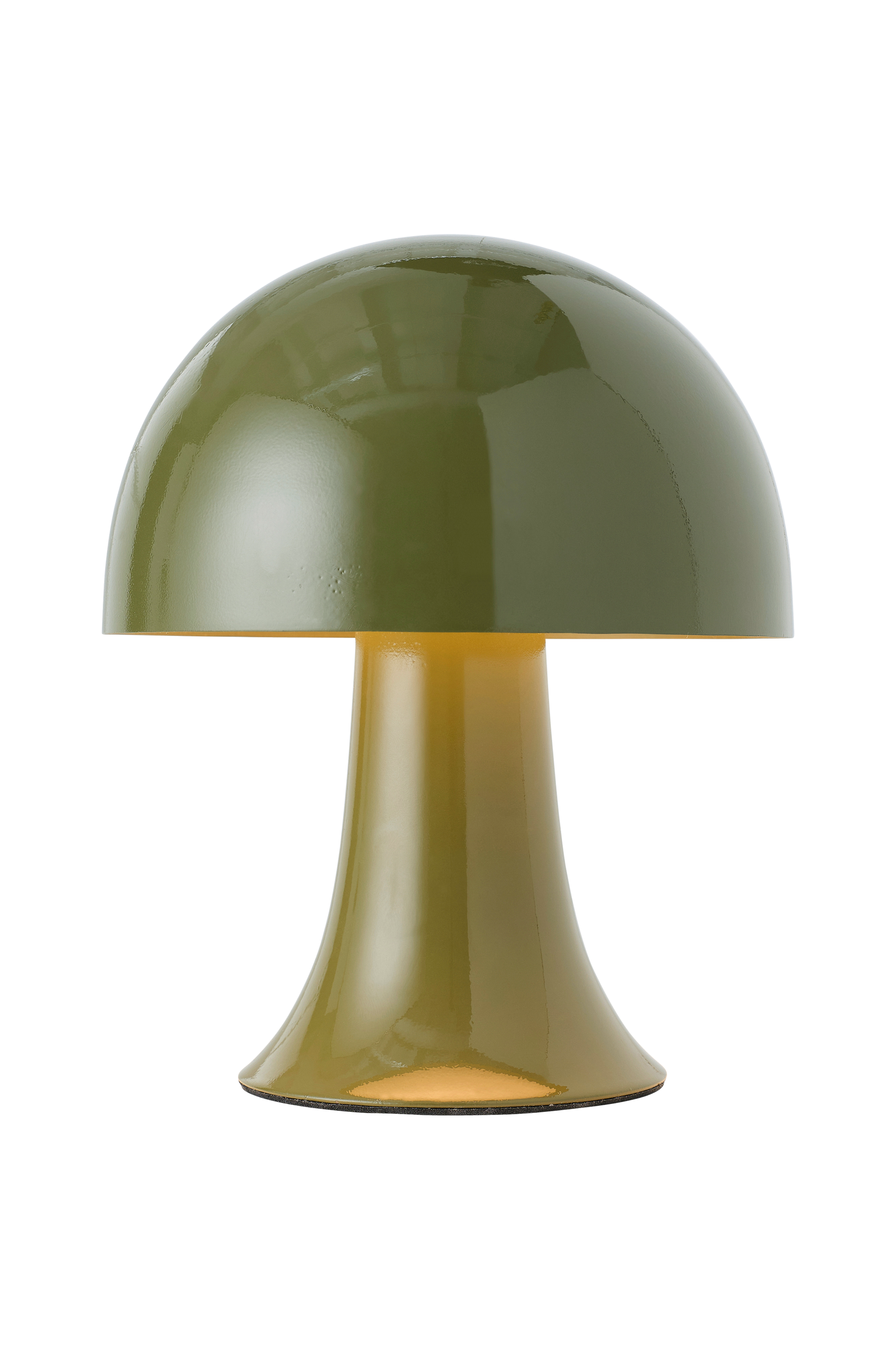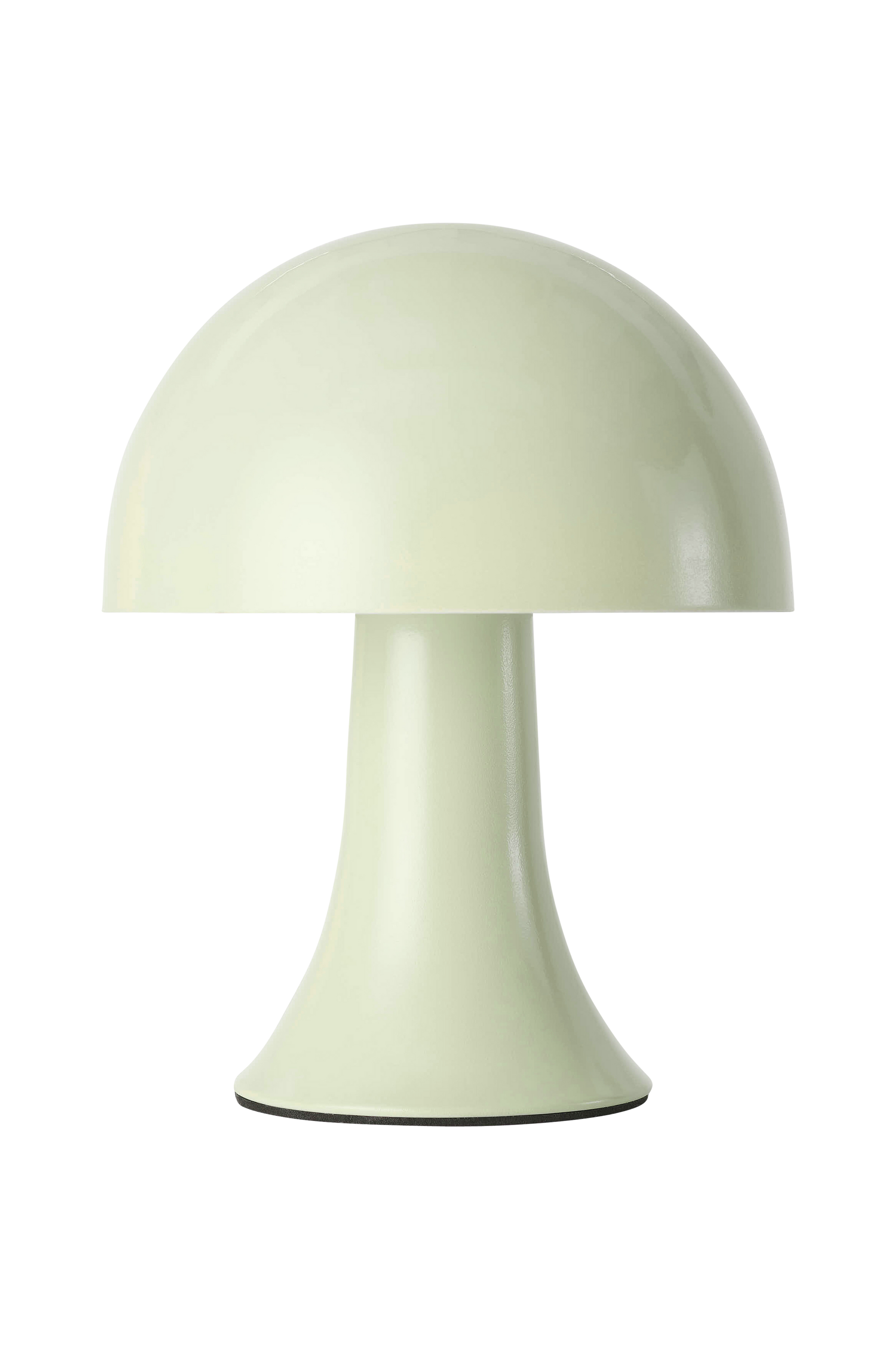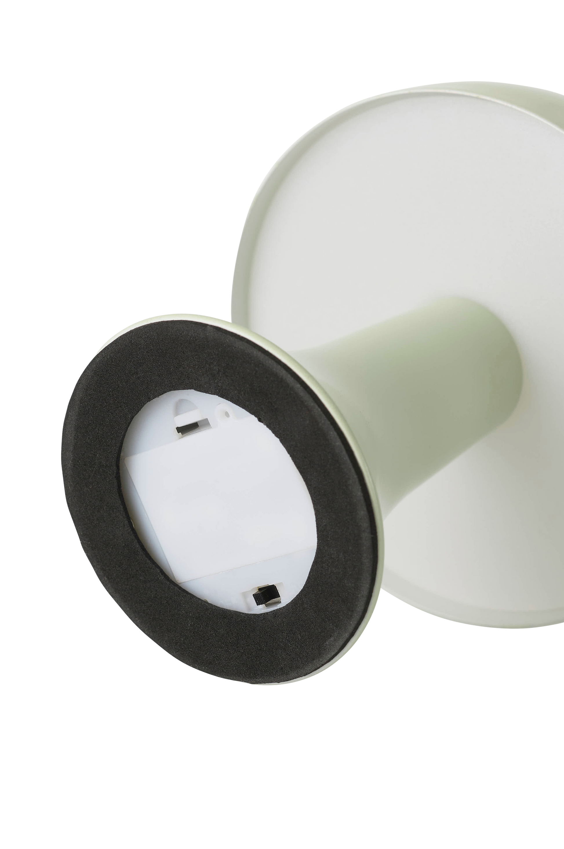 Batterísdrifinn lampi með skerm úr glansandi málmi og plastfæti.