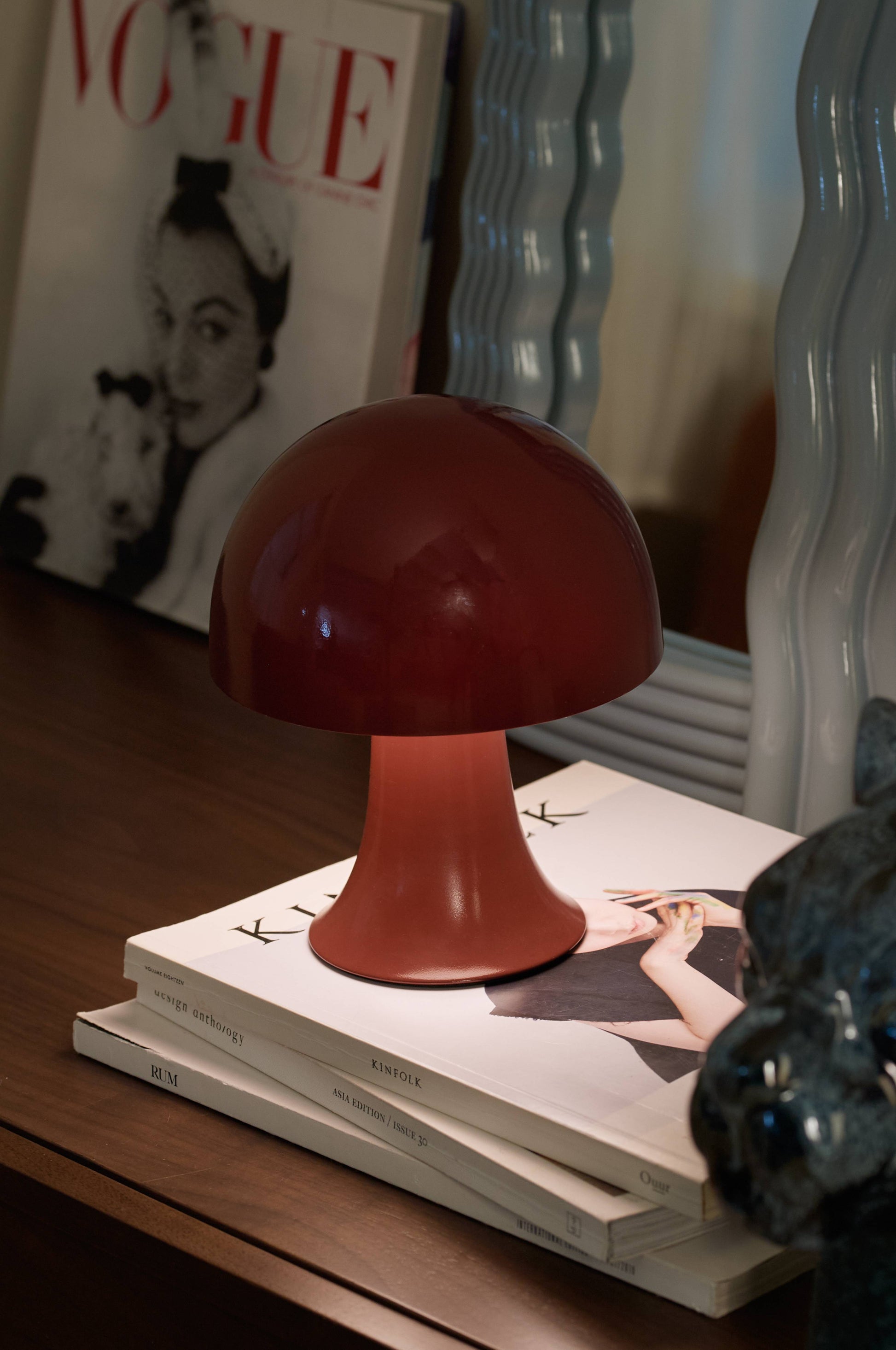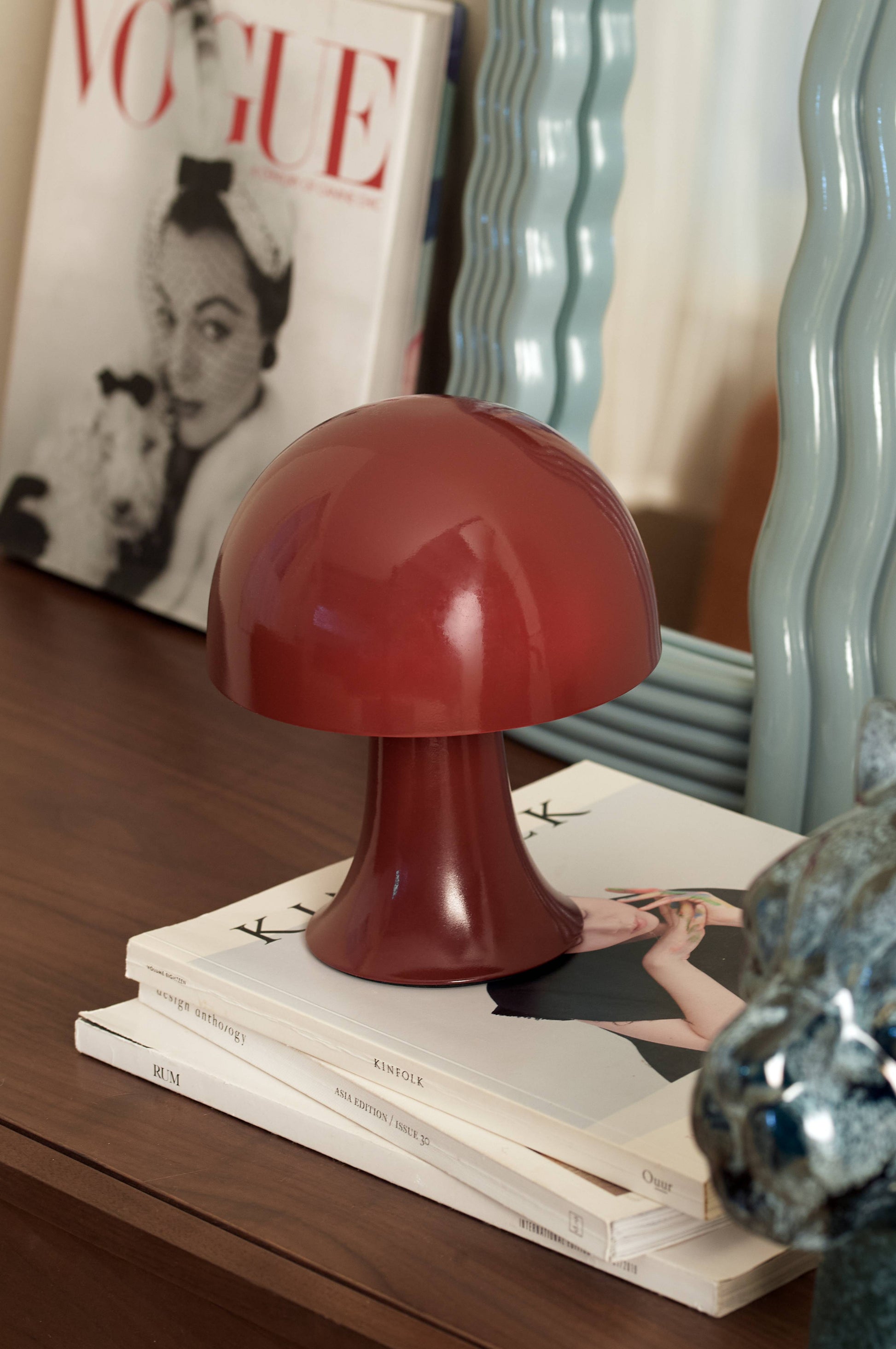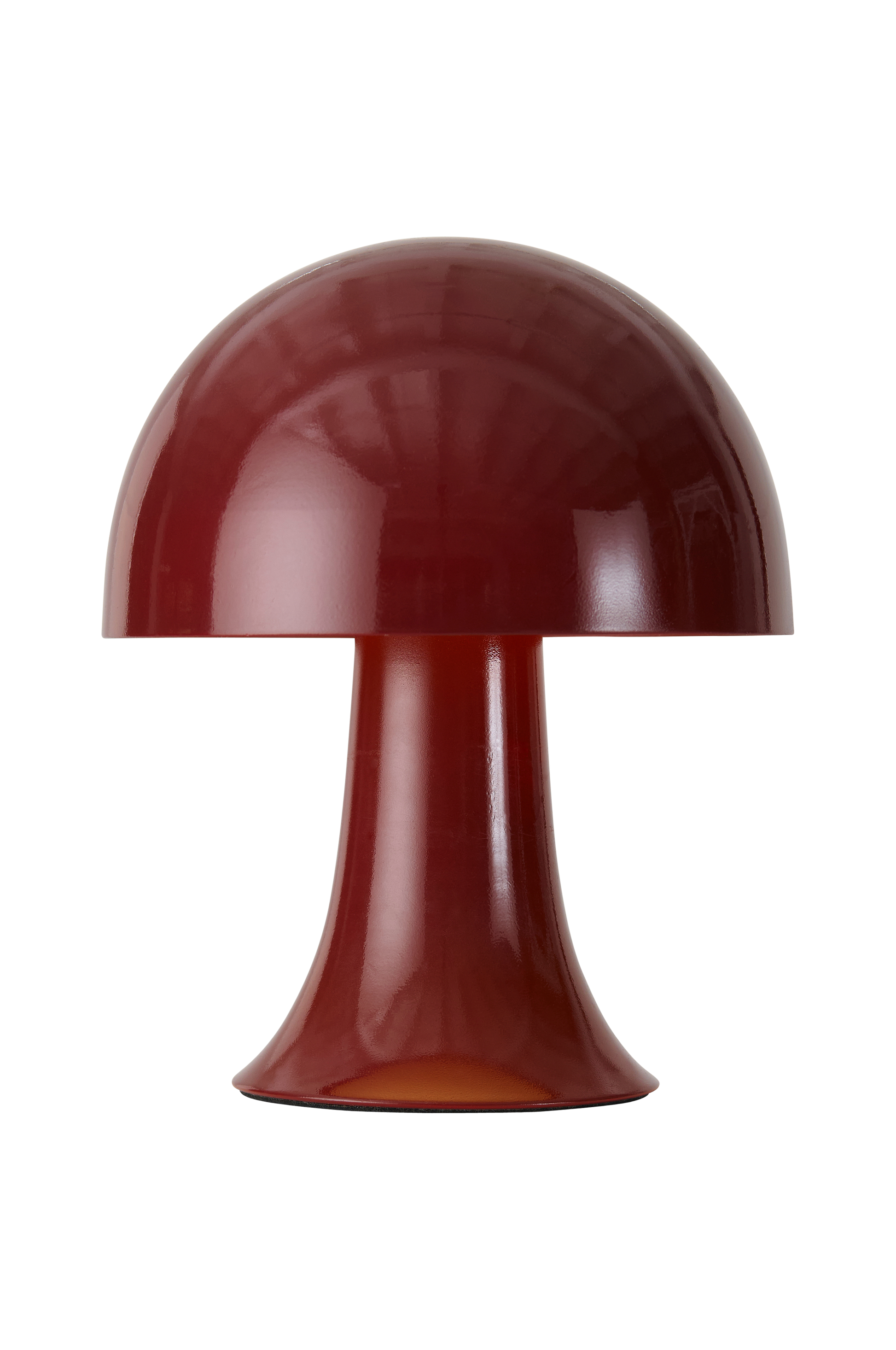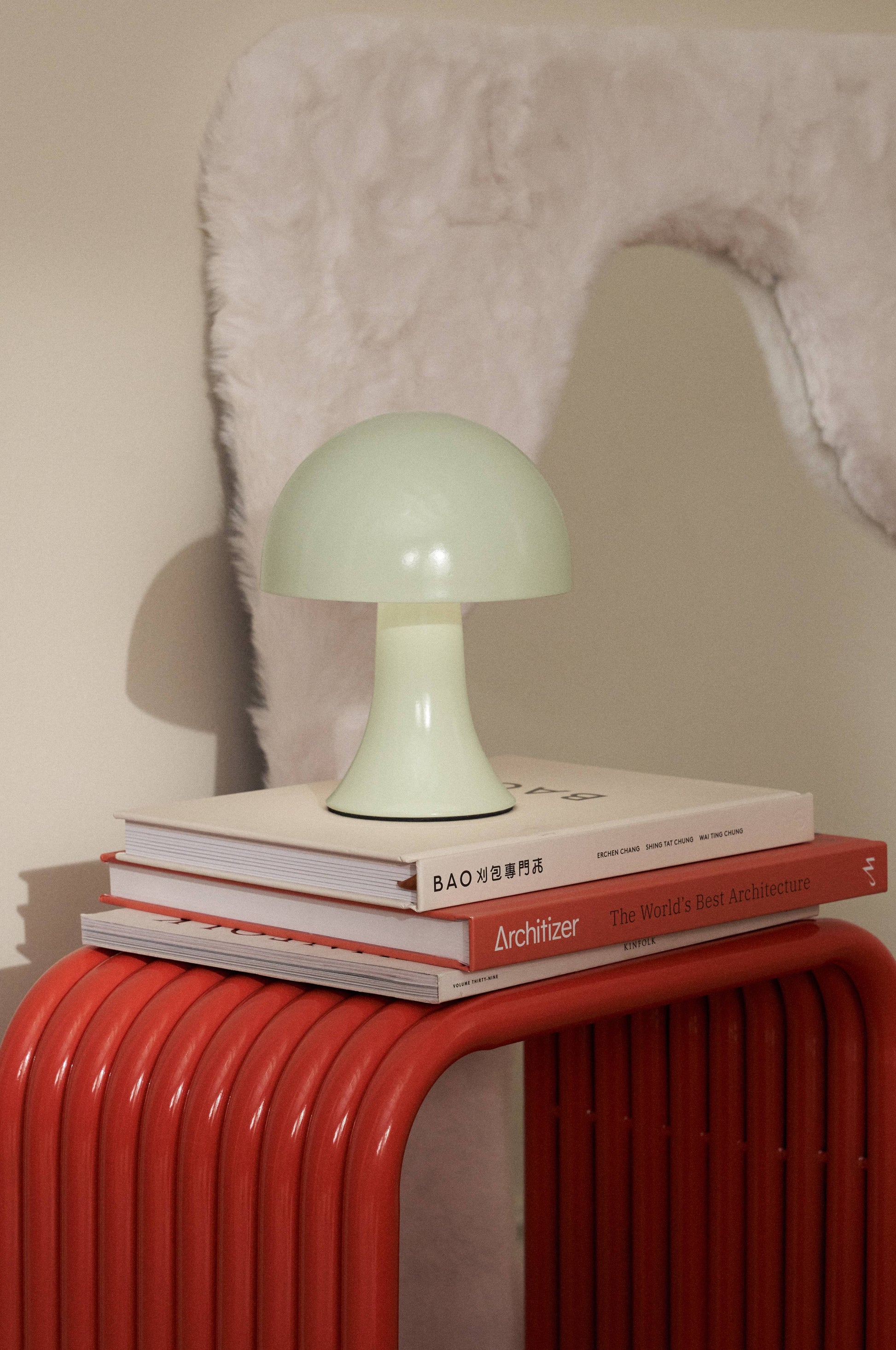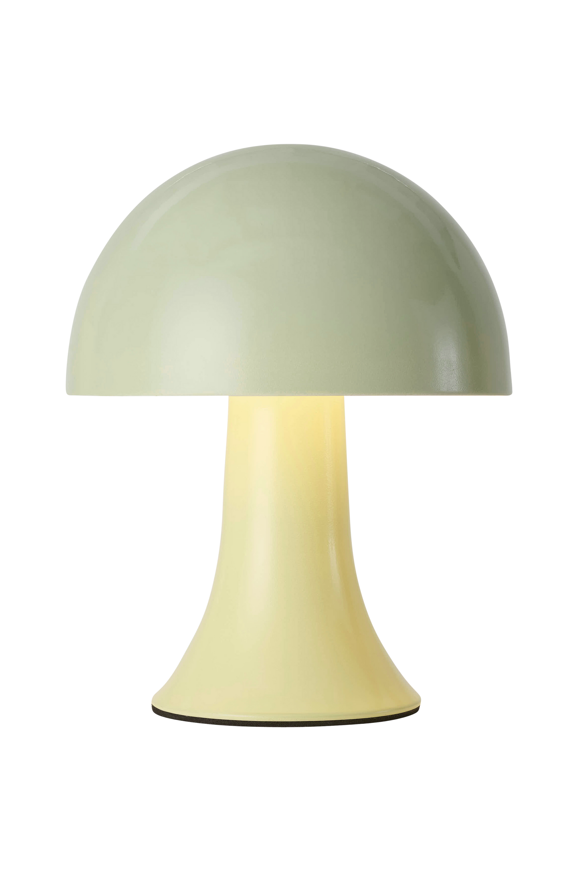 Batterísdrifinn lampi með skerm úr glansandi málmi og plastfæti.