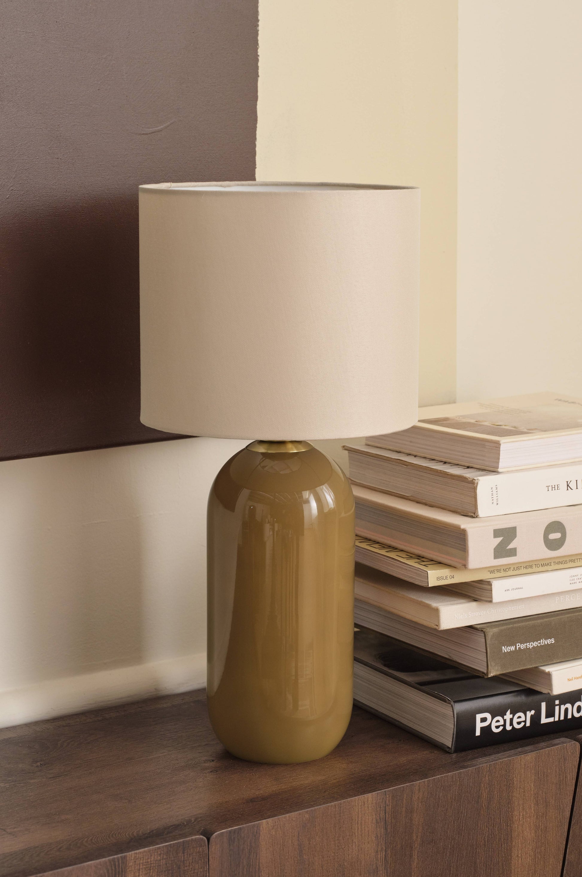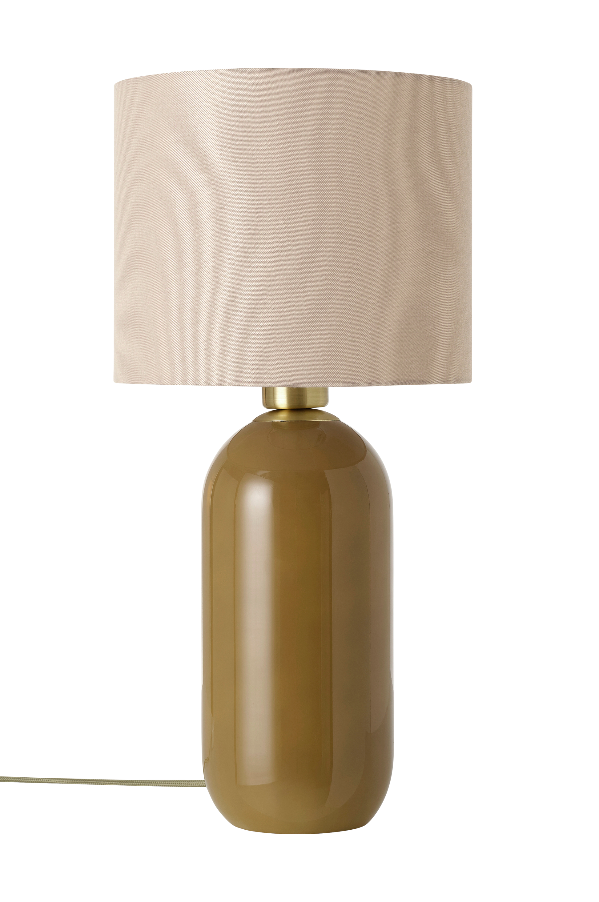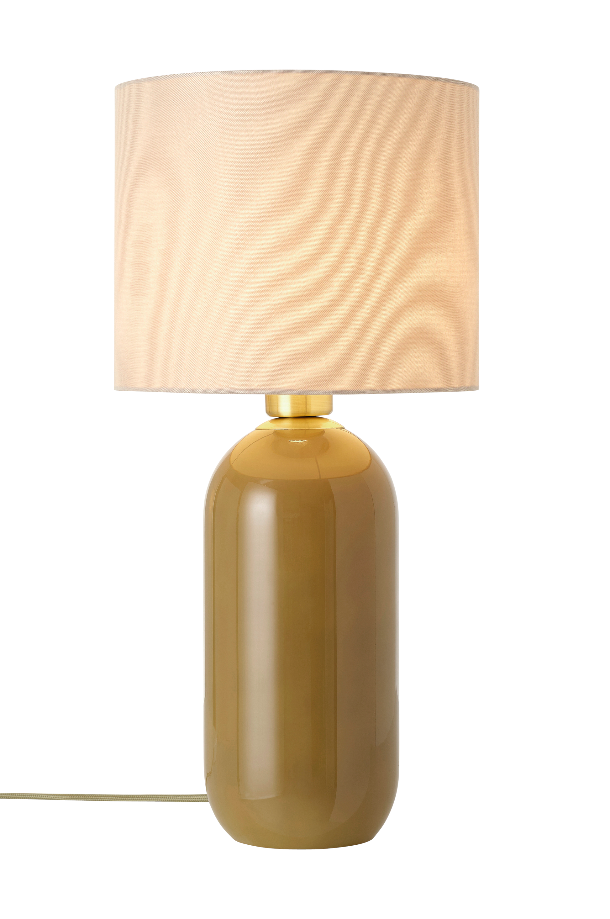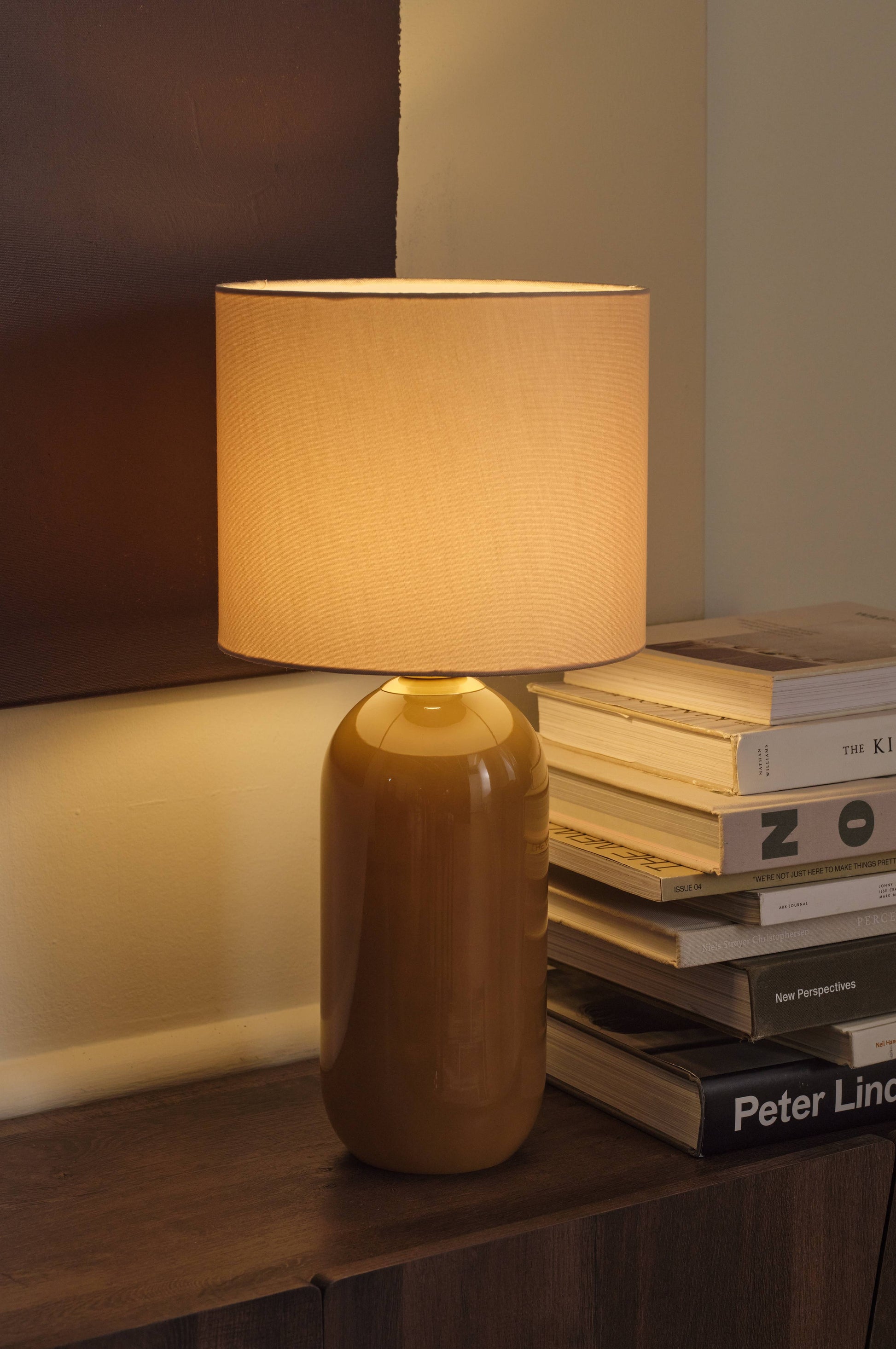 Borðlampi með glerfæti og skerm ur líni.