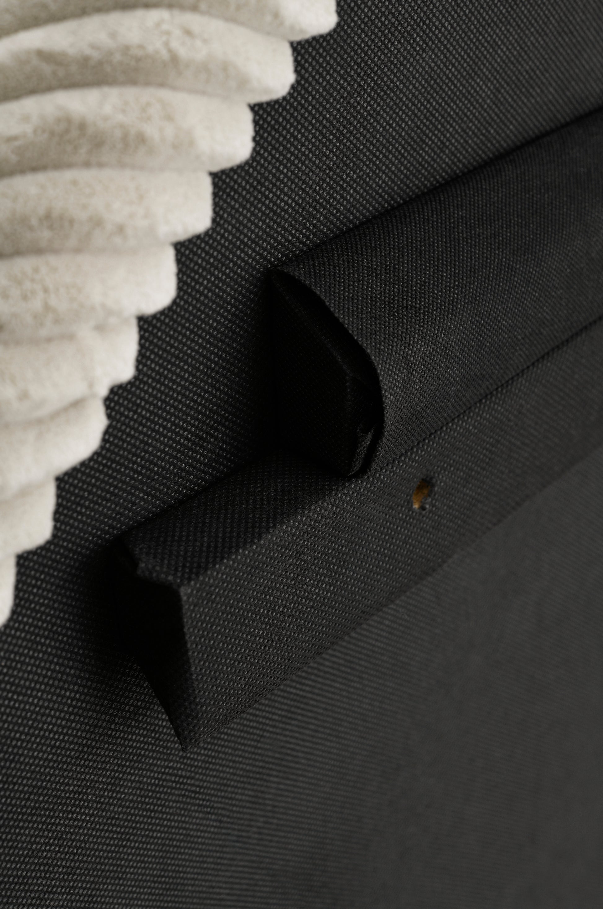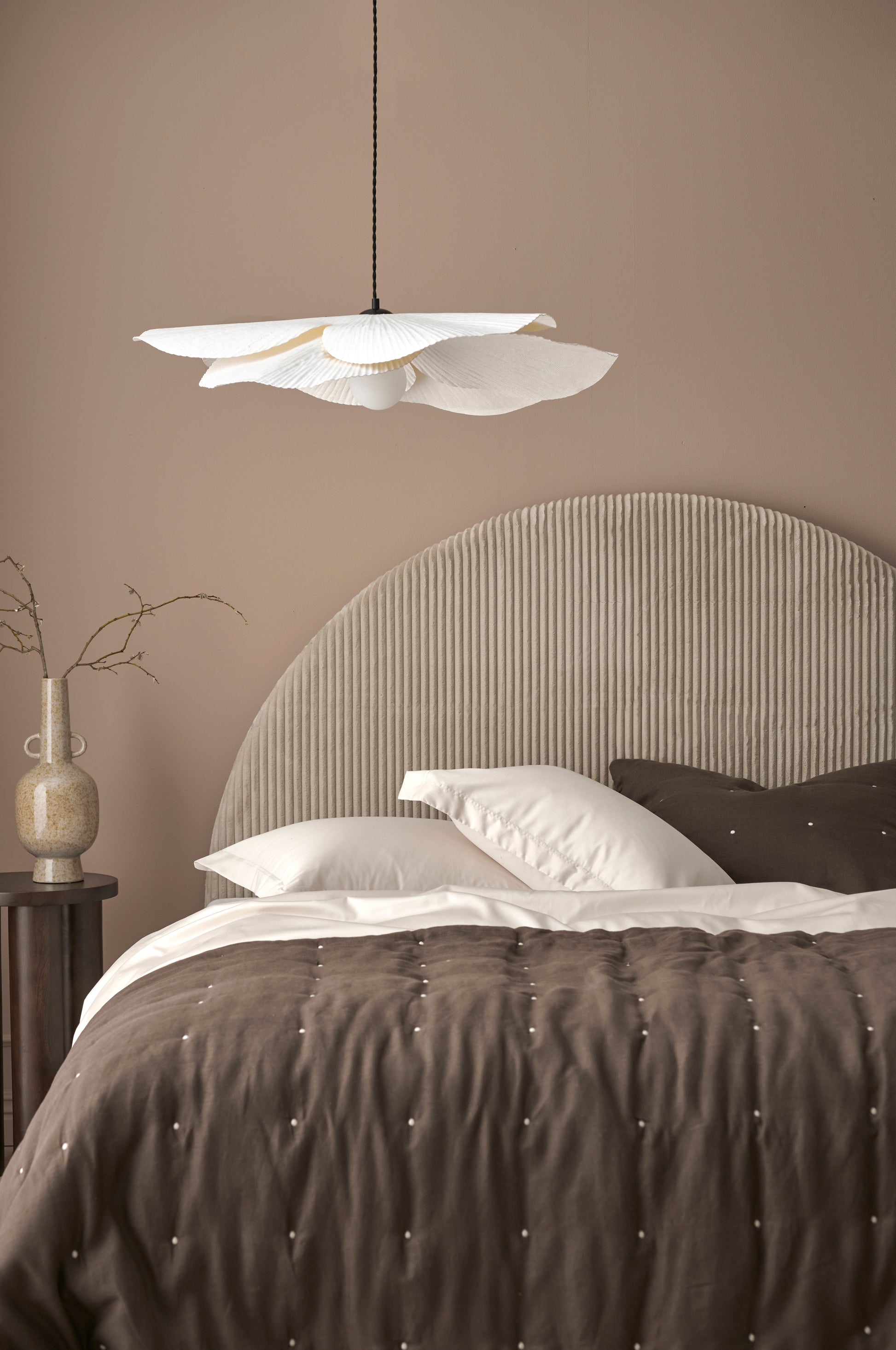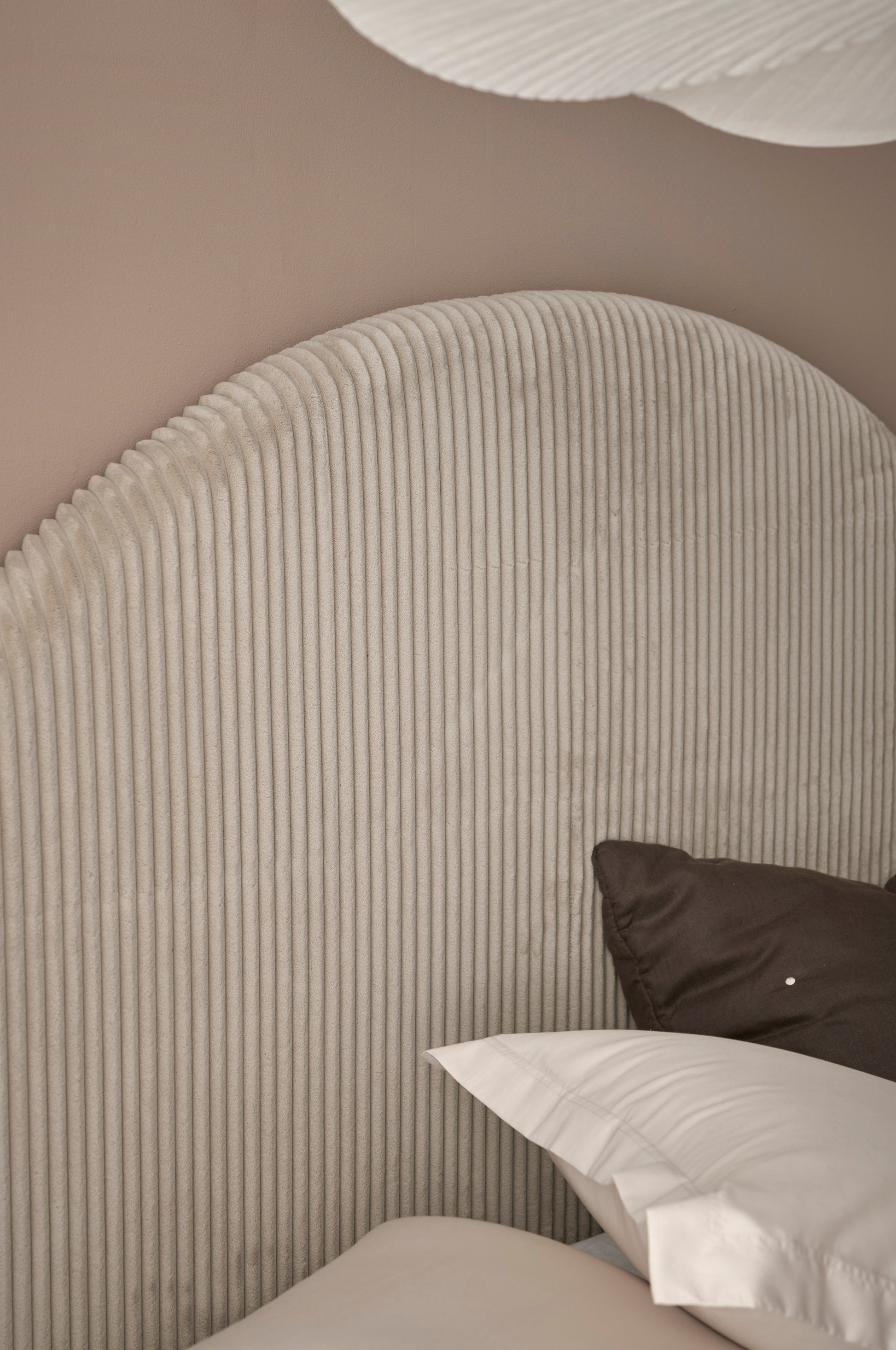 Rúmgafl með áklæði úr corduroy úr 100% pólýester. Umgjörð úr gegnheilri furu og krossviði.